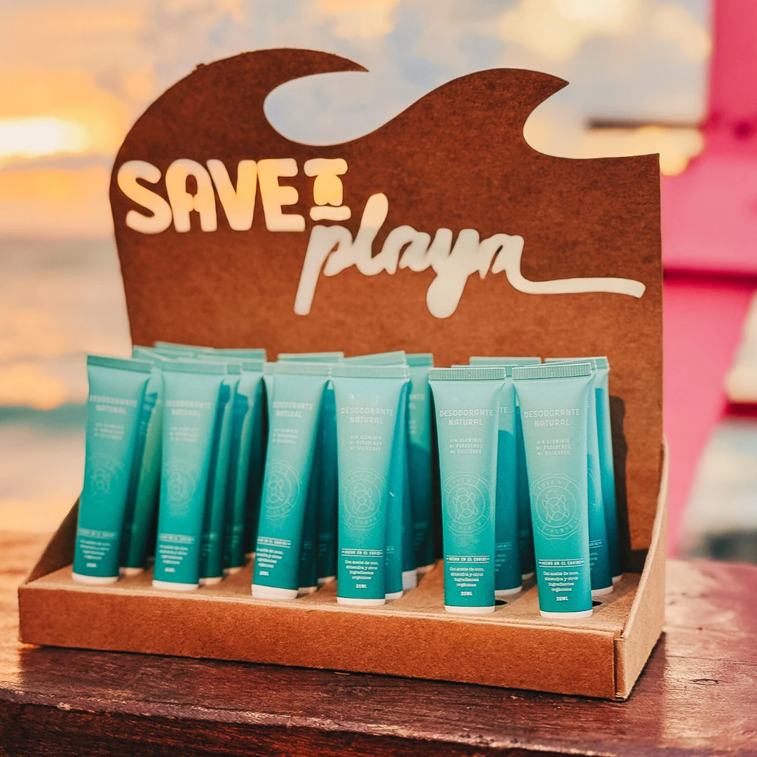 La promoción empresa empresa incluye: 24 unidades de desodorante natural Save a Playa + 1 eco-stand biodegradable